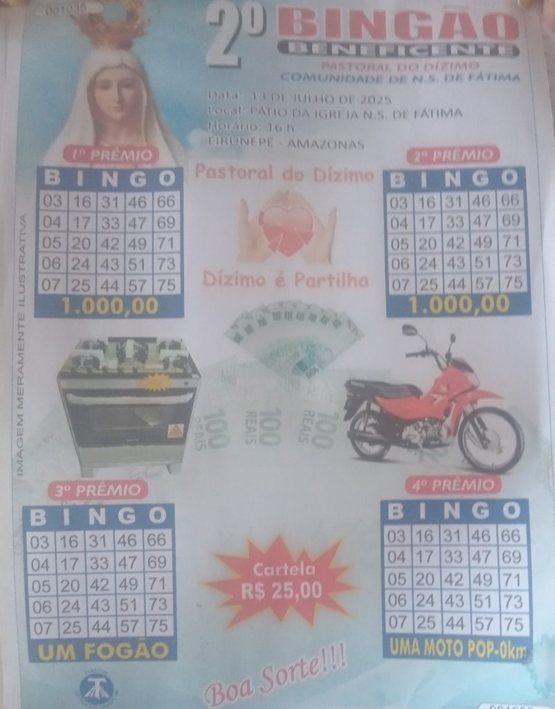 ATENÇÃO EIRUNEPÉ-AM: 2° Bingão Beneficente da Comunidade Nossa Senhora de Fátima será realizado neste domingo (31)