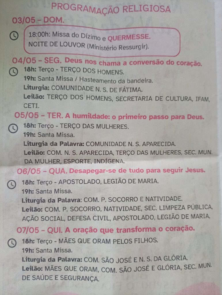 A abertura, no dia 03 de maio, já marca o início de uma intensa caminhada espiritual com missa do dízimo, quermesse e noite de louvor conduzida pelo Ministério Ressurgir, reunindo a comunidade em um ambiente de fé e confraternização.