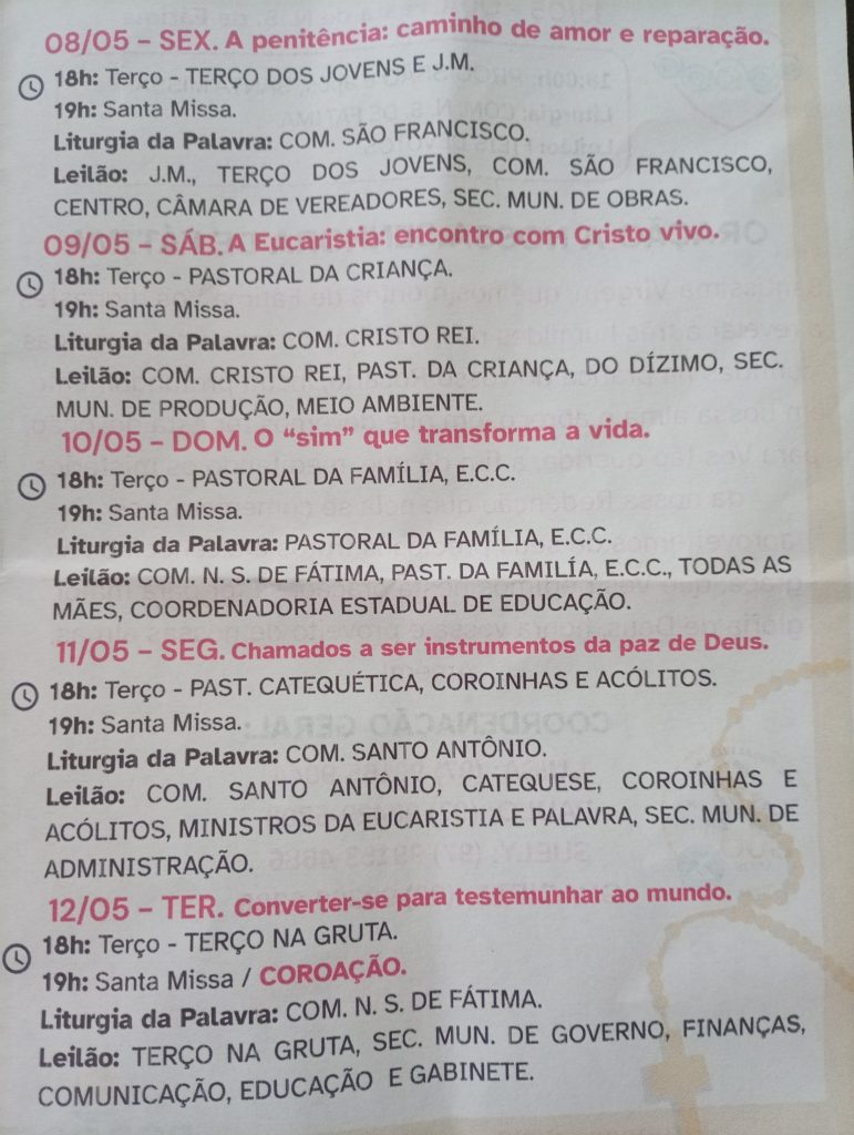 Ao longo dos dias, a programação segue com momentos de oração do terço, celebrações eucarísticas, liturgias e leilões organizados por diferentes comunidades, pastorais e instituições locais. Cada dia traz uma reflexão específica, convidando os fiéis a uma profunda jornada interior.