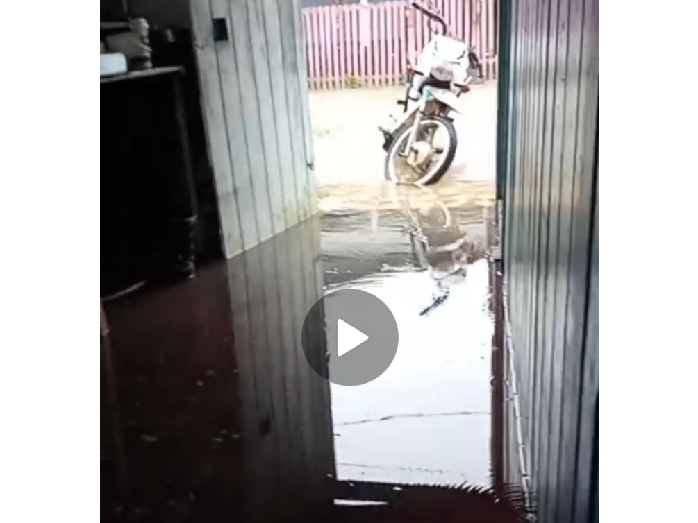 Imagens enviadas ao portal mostram a água avançando rapidamente pela rua e entrando no interior da residência, deixando o morador preocupado com a possibilidade de novos prejuízos caso a chuva continue com a mesma intensidade.