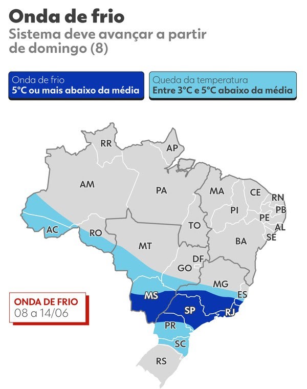 Ao contrário do que ocorre na capital Manaus que costuma escapar desse tipo de fenômeno cidades como Eirunepé, Guajará, Envira, Ipixuna e Boca do Acre estão na rota da massa de ar frio que, embora menos intensa do que a registrada em maio, promete derrubar as temperaturas ao longo da semana. A friagem deverá se estender até o dia 14 de junho.