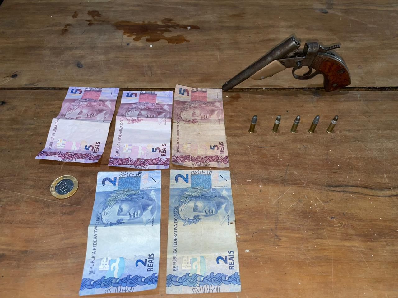 Durante as diligências na área indicada, os policiais localizaram o suspeito, identificado como Daniel Rodrigues da Silva, de 22 anos. Ao realizarem a abordagem e revista pessoal, foi encontrado em sua posse um revólver calibre 22, contendo uma munição deflagrada e cinco munições intactas.