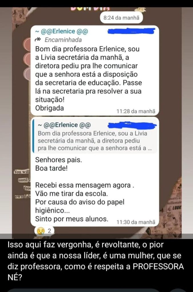 A própria professora expôs a situação em grupos de pais de alunos, demonstrando tristeza com a decisão da gestão escolar. Em sua mensagem, ela lamentou o afastamento e deixou claro que tudo começou após ela alertar sobre a falta de insumos básicos para os alunos. “Sinto por meus alunos”, escreveu.